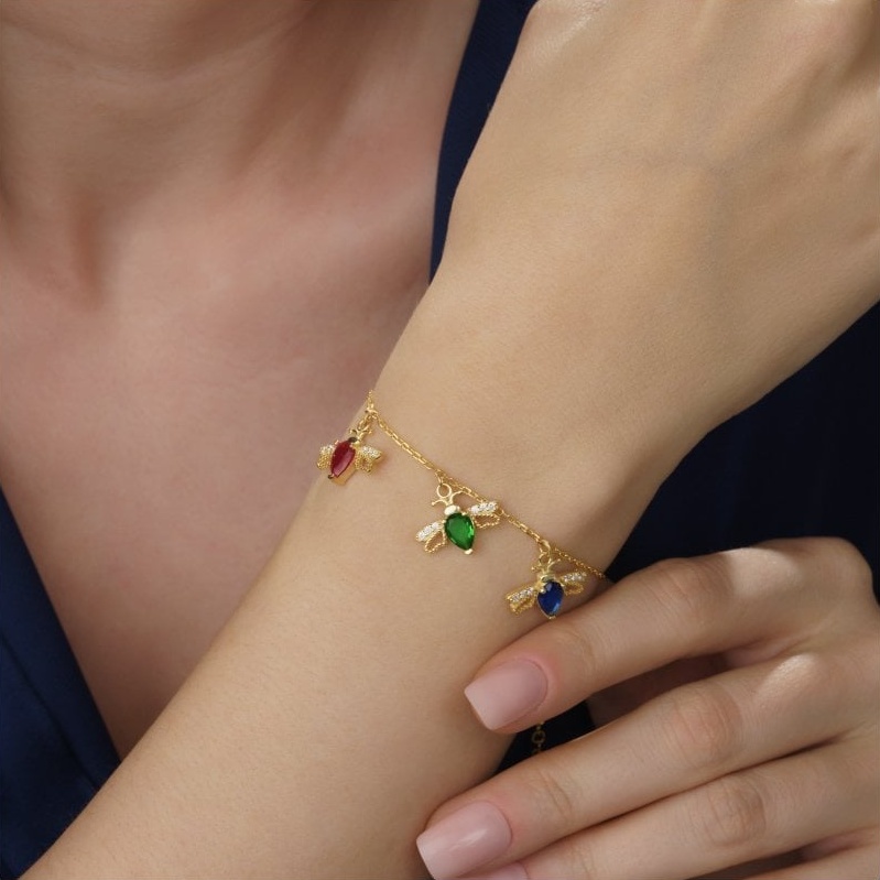14 Ayar Altın Kaplama Kişiye Özel Doğum Taşlı Arı Kuşu Bileklik 🐝