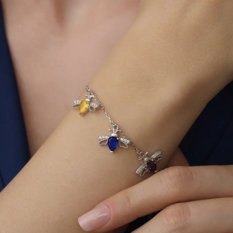 Bileklik üzerine isteğe bağlı olarak 1’den 5’e kadar arı kuşu figürü eklenebilir. Her bir kuş, seçtiğiniz doğum taşı renginde hazırlanır. Böylece çocuklarınızı, eşinizi, annenizi ya da hayatınızdaki değerli kişileri simgeleyen anlamlı bir takıya sahip olabilirsiniz. Her renk bir ayı ve bir anlamı temsil eder; tasarım tamamen size özel oluşturulur.
