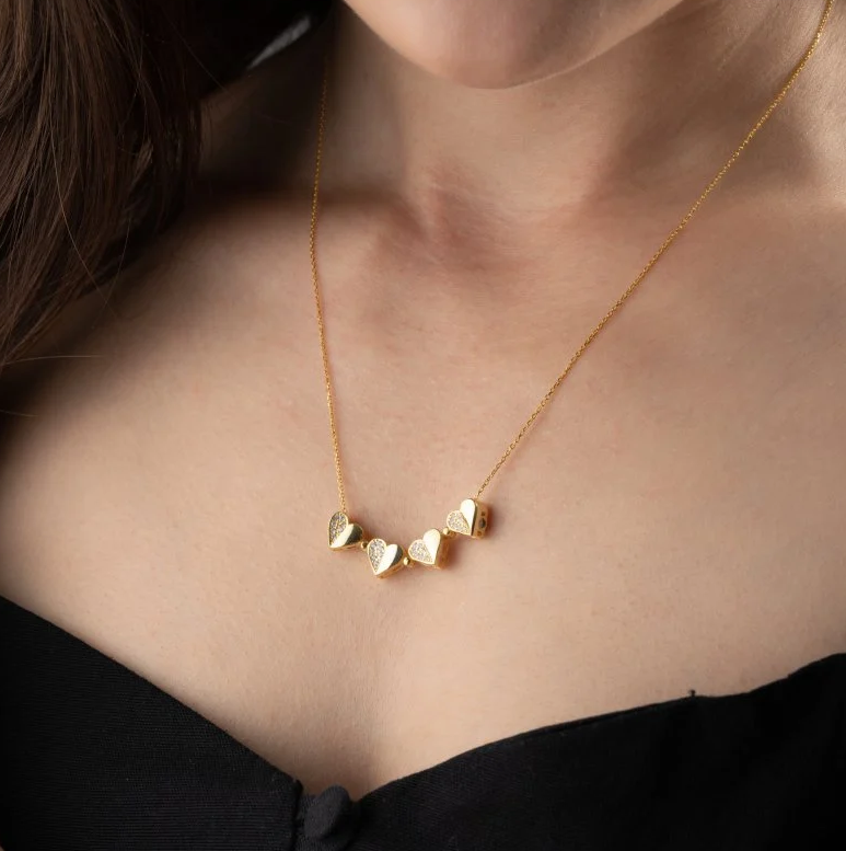 925 Ayar Gümüş Mıknatıslı Dörtlü Kalp Kolye, gümüş işleme sanatını modern takı tasarımıyla buluşturan özel bir aksesuardır. Parıltılı zirkon taşlar ve pürüzsüz gümüş kaplama, kolyeye göz alıcı bir zarafet kazandırır. Beyaz zirkon taşlar ve gold detaylar ile tasarlanan kolye, her yaştan ve her stilden kadına hitap eden şık bir takıdır. Sevdiklerinize hediye edebileceğiniz anlamlı ve değerli bir seçenektir; annenize, arkadaşınıza, öğretmeninize, sevgilinize veya çocuğunuza sunabilirsiniz.